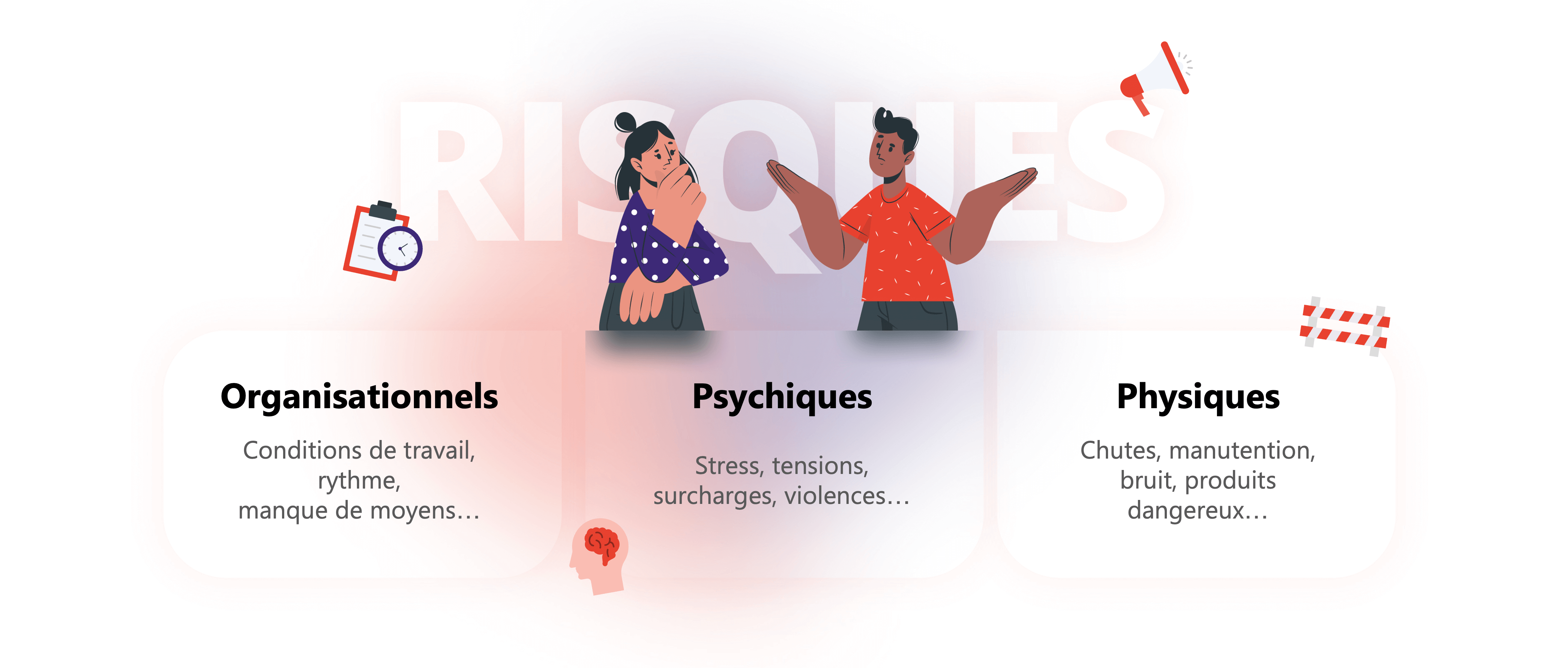 Les risques peuvent être physiques (chutes, manutention, bruit, produits dangereux, …), psychiques (stress, tensions, surcharge, violences, …), ou organisationnels (conditions de travail, rythme, manque de moyens, …).