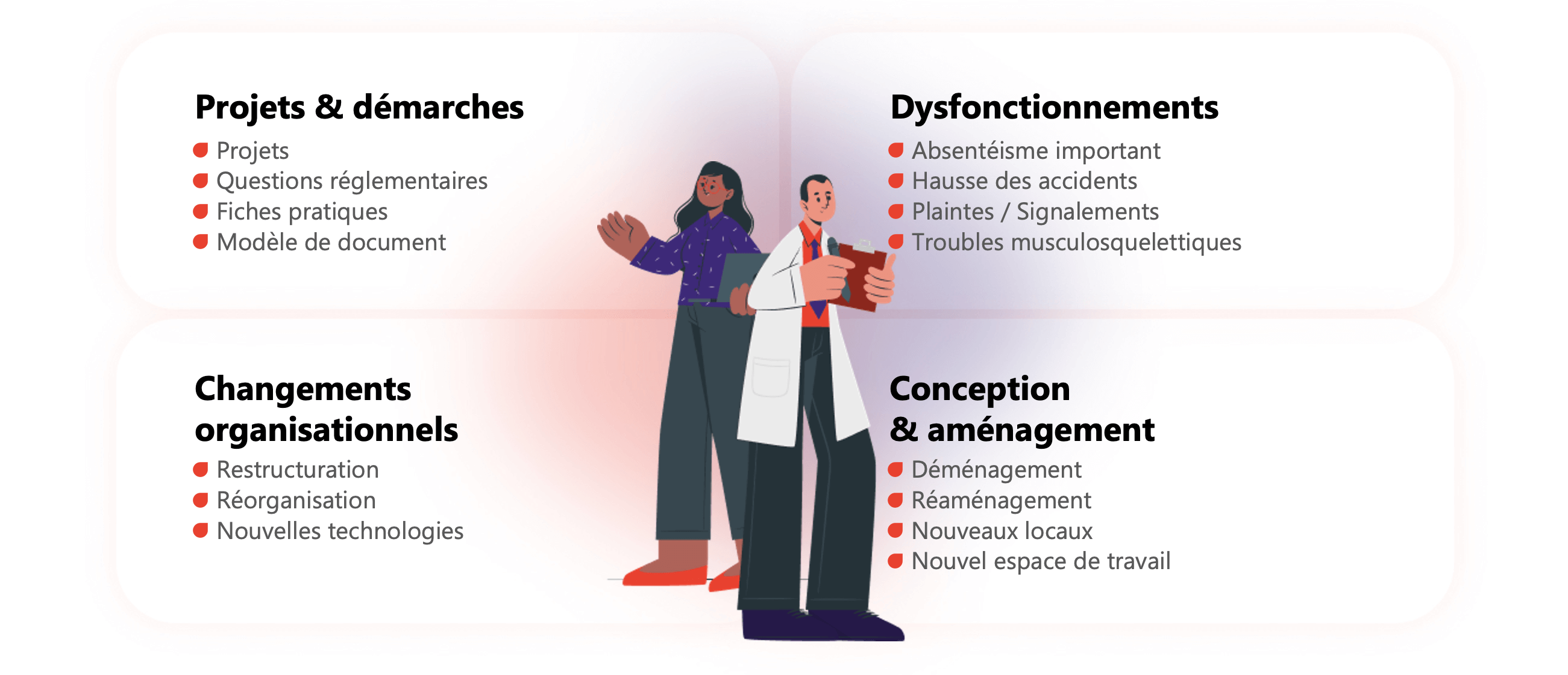 En cas de projet, démarche, questions réglementaires, besoin de fiches pratiques et de modèles de documents, des réponses existent à vos demandes pour améliorer les conditions de travail et respecter vos obligations réglementaires. De même, en cas de dysfonctionnement interne, difficultés ou correction de situations existantes telles qu’un taux d’absentéisme important, une hausse des accidents du travail, signalement de dysfonctionnements, plaintes d’agents, ou encore des troubles musculosquelettiques, des propositions adaptées seront formulées.